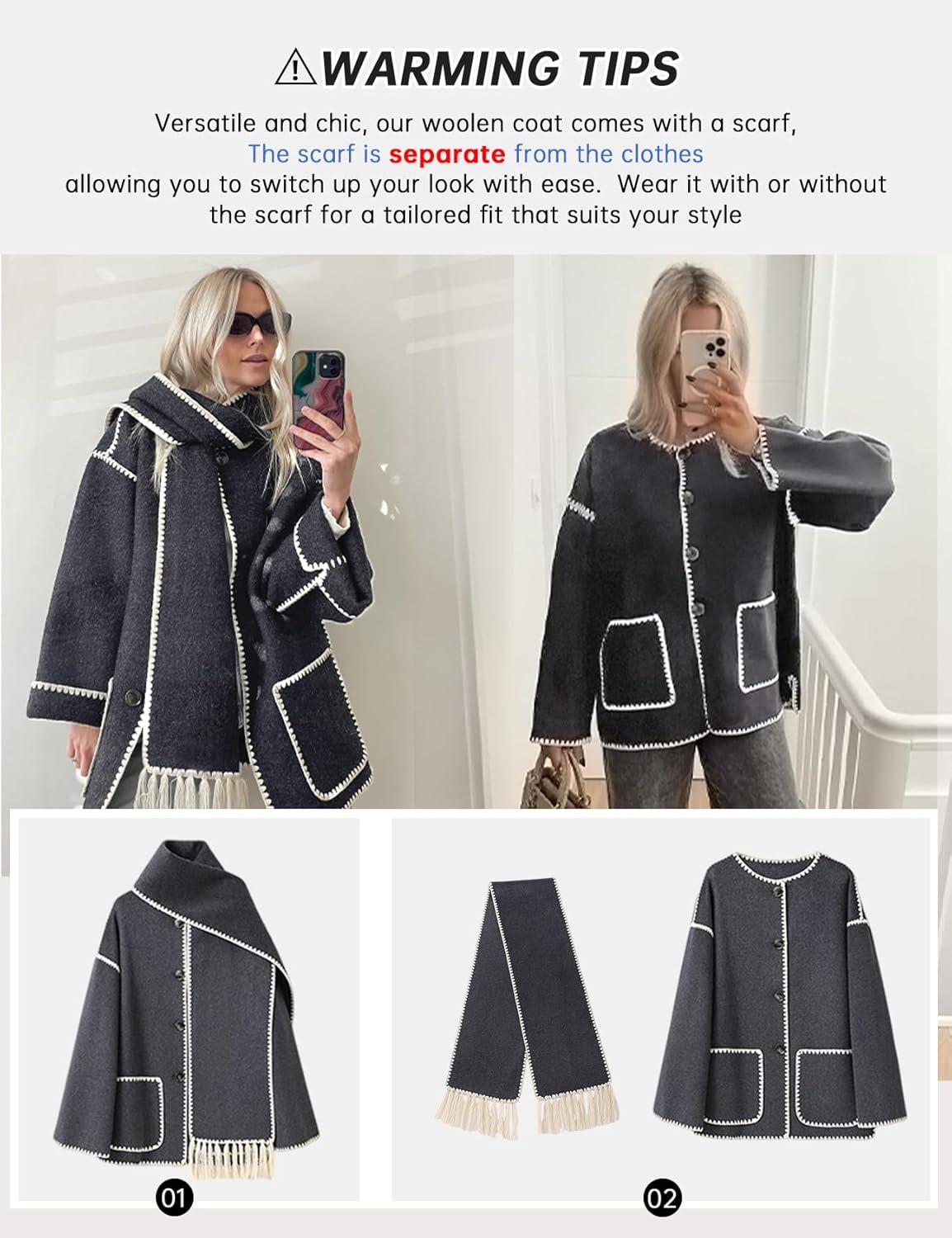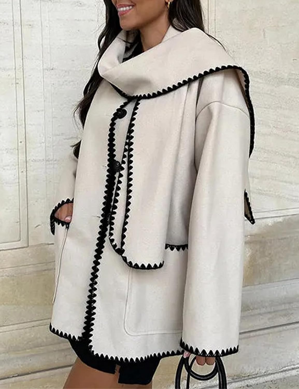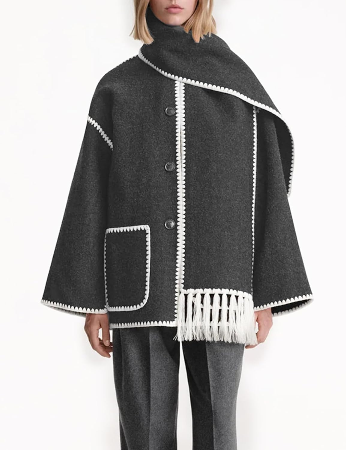 Introducing the Women’s Embroidered Scarf Jacket, a stylish and cozy outerwear option for the upcoming season. This oversized button-down coat is crafted from a luxurious wool blend fabric, ensuring both warmth and comfort.